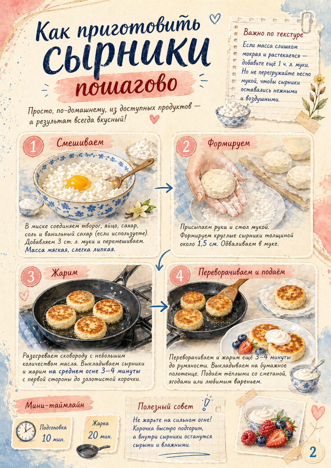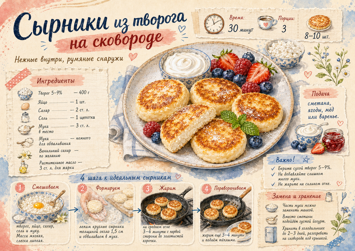 Краткая иллюстрированная памятка по приготовлению сырников на сковороде.