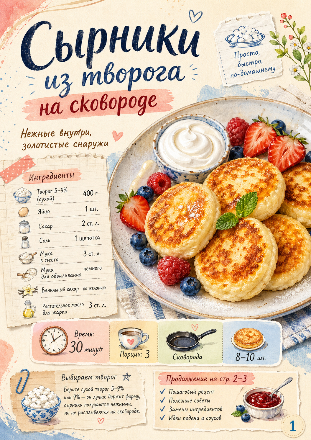 Первая страница мини-журнала: состав, время приготовления и выбор творога для сырников.