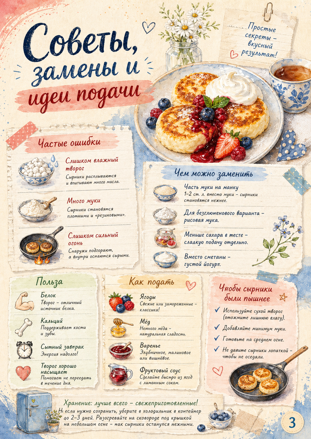 Третья страница мини-журнала: частые ошибки, замены ингредиентов, польза творога и идеи подачи.