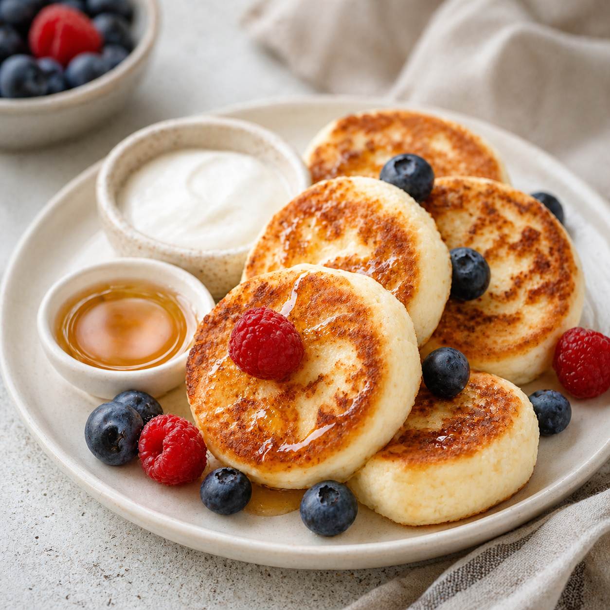 Кефир лучше не добавлять прямо в тесто без пересчёта пропорций: он сделает массу более влажной, и сырники могут хуже держать форму. Если хочется кисломолочной подачи, кефир можно использовать отдельно или взять густой йогурт.