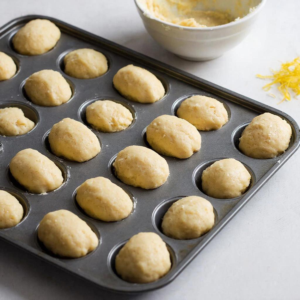 Взбейте яйца в крепкую пену. В отдельной миске соедините муку, сахар, разрыхлитель и лимонную цедру. Добавьте яйца, перемешайте миксером, затем влейте масло и еще раз доведите тесто до гладкости. Накройте миску пищевой пленкой и уберите тесто в холодильник на 1 час.