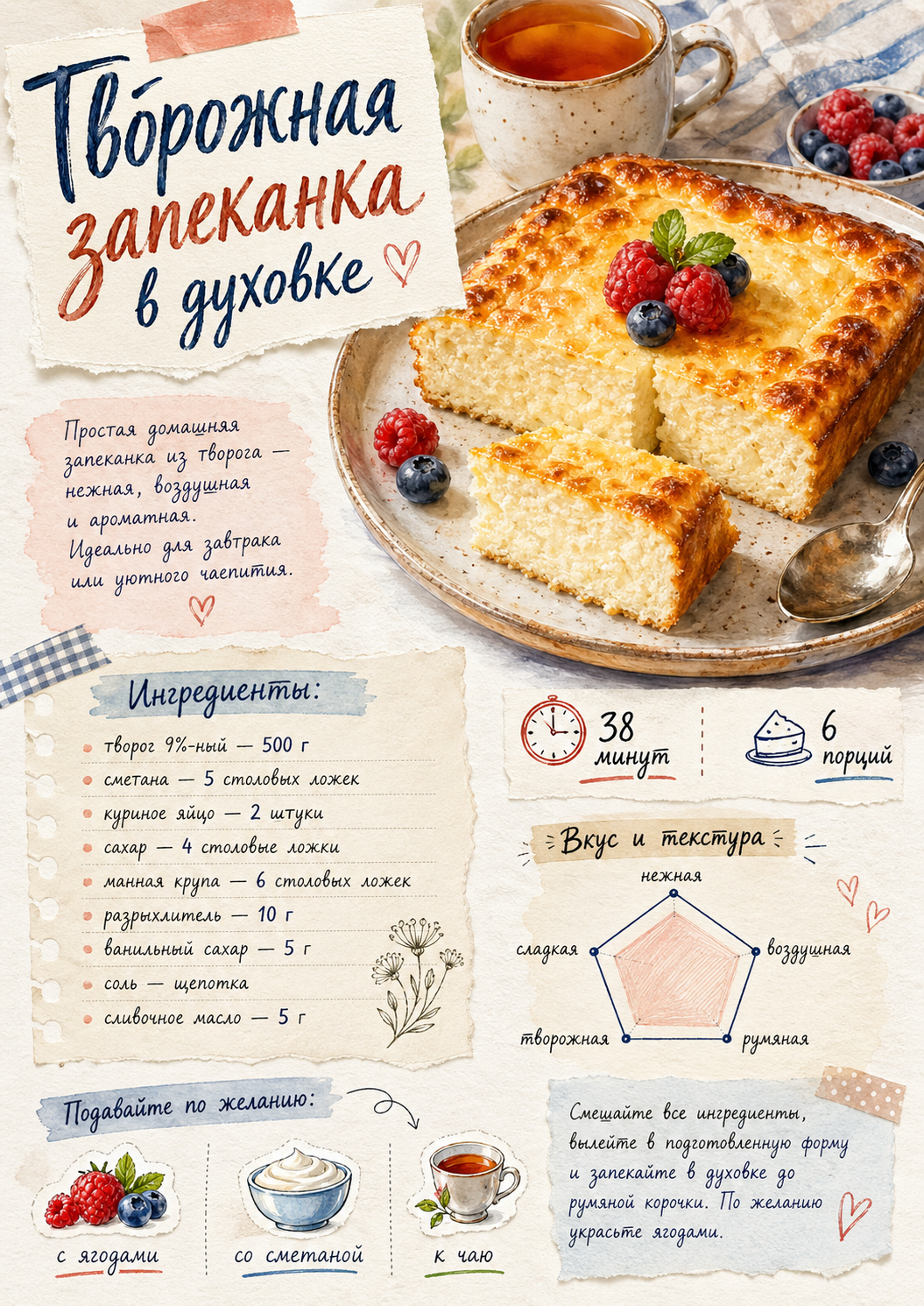 Первая страница мини-журнала показывает состав, время приготовления, порции и варианты подачи творожной запеканки.