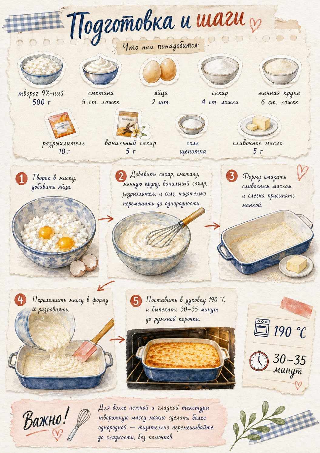 Краткая визуальная схема приготовления творожной запеканки в духовке.