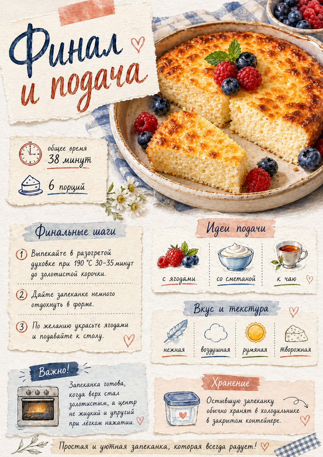 Для этого рецепта запеканку выпекают при 190 °C 30–35 минут до румяной корочки. Духовку лучше заранее разогреть, чтобы творожная масса начала готовиться равномерно с первых минут.