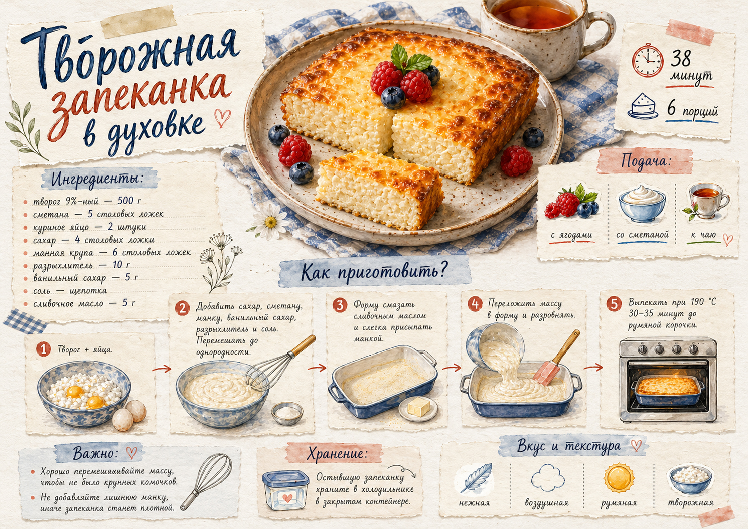 Манную крупу в этом рецепте лучше не убирать без необходимости: она помогает массе держать форму. Если нужна запеканка без манки, лучше брать отдельный рецепт запеканки с другими пропорциями, чтобы результат был предсказуемым.