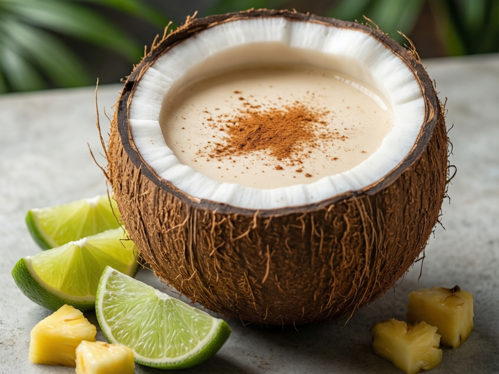 Этот рецепт хорош тем, что сочетает очень понятные тропические вкусы и яркую подачу. Кокос, ананас, лайм и корица дают мягкий, насыщенный и запоминающийся результат.