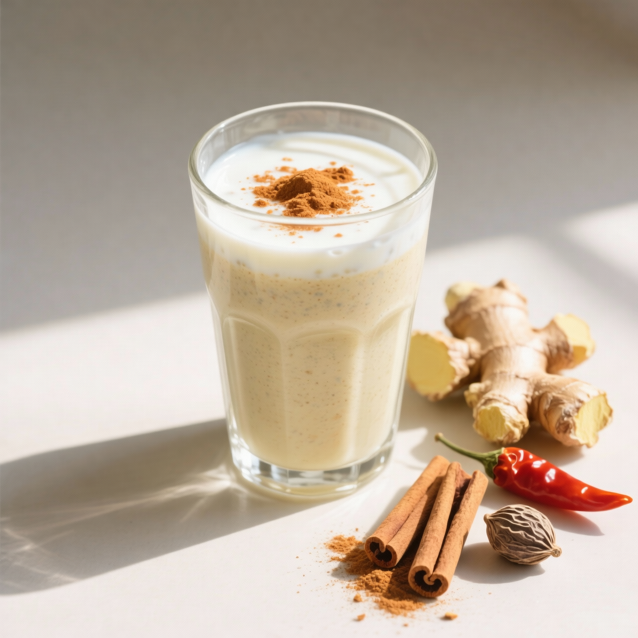 Короткий ответ: имбирь, чили, корица и мускатный орех создают выраженный теплый вкус. Кефир смягчает эту смесь и делает напиток более удобным для ежедневной подачи.