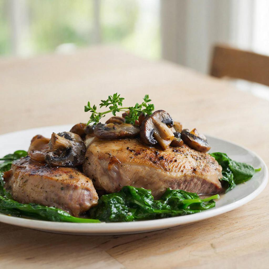 По этому рецепту такая подача особенно удобна: мясо остаётся главным акцентом, а грибы и шпинат делают блюдо более сочным и насыщенным.