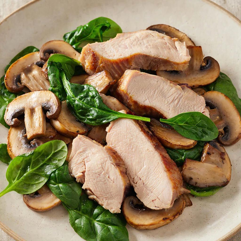 Стейки из индейки с грибами и шпинатом – это быстрое горячее низкокалорийное блюдо, в котором мясо получается сочным, а шампиньоны и шпинат дают тёплую, насыщенную овощную подачу. По этому рецепту вкус получается собранным и очень удобным для повседневного ужина.