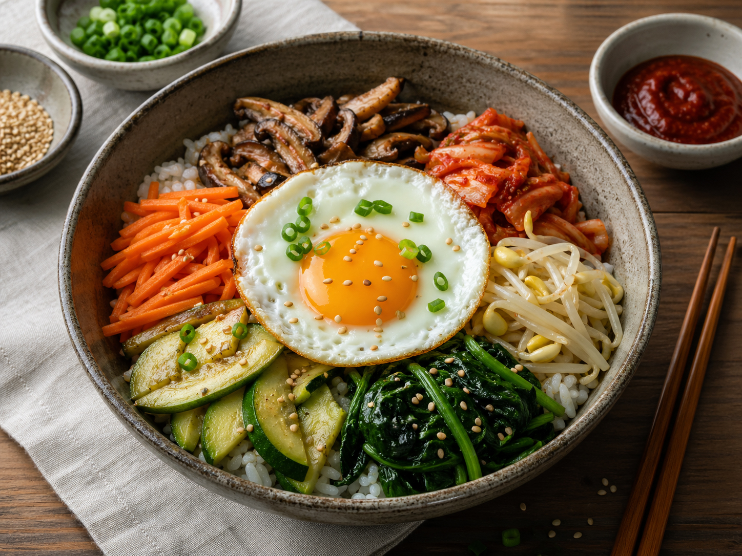 Бибимбап с овощами – это яркий корейский боул с тёплым рисом, отдельно приготовленными овощами, яйцом, кимчи и остро-сладким соусом на основе кочхуджана. Блюдо удобно готовить дома: компоненты собираются в одной миске, а вкус получается насыщенным за счёт сочетания острого, кислого, орехового и умами.