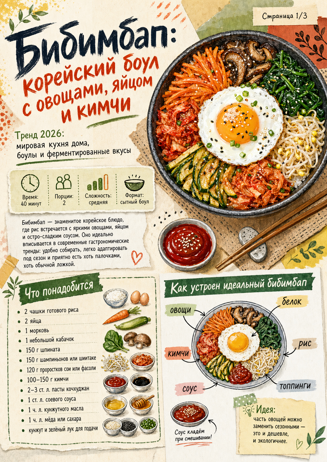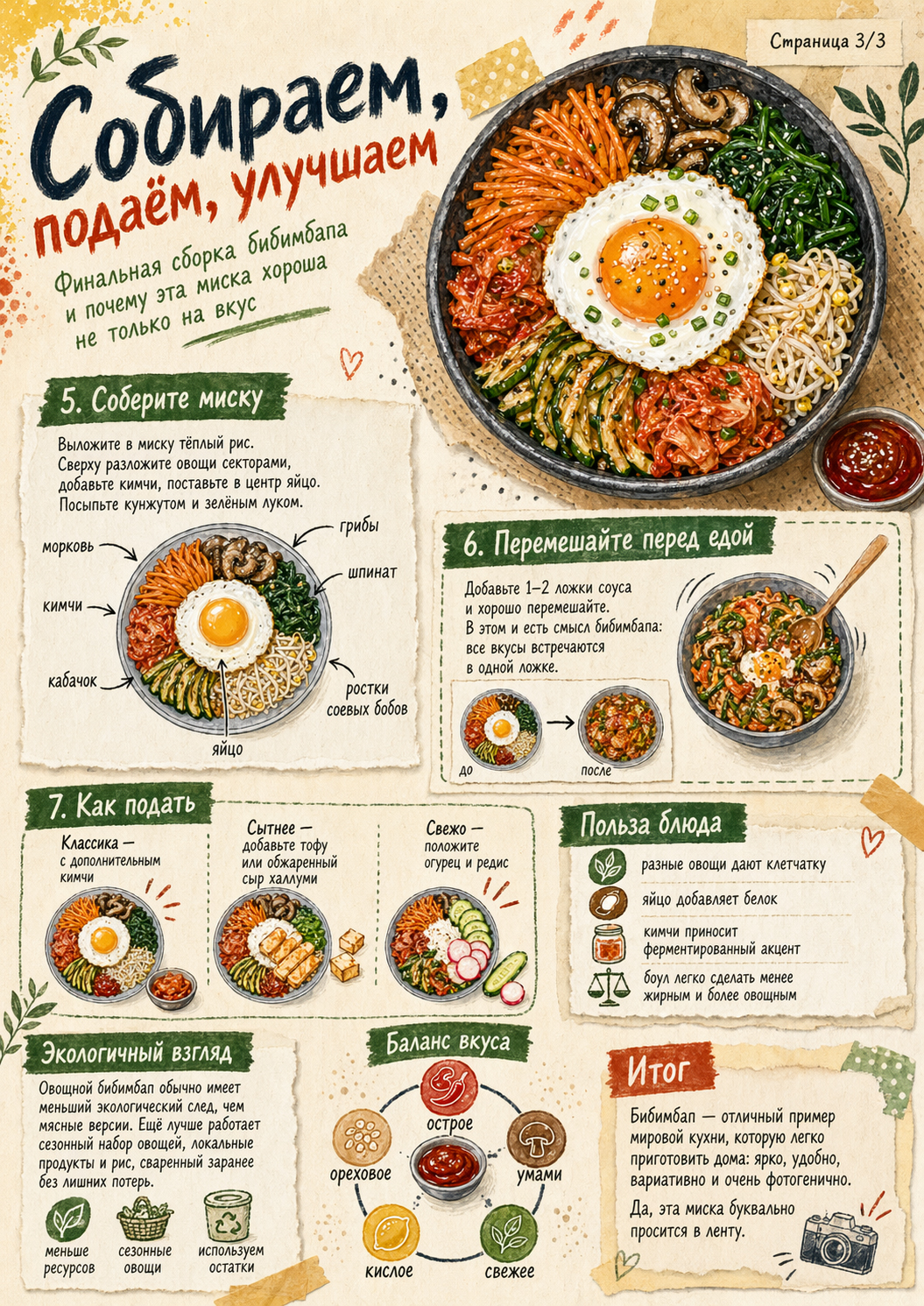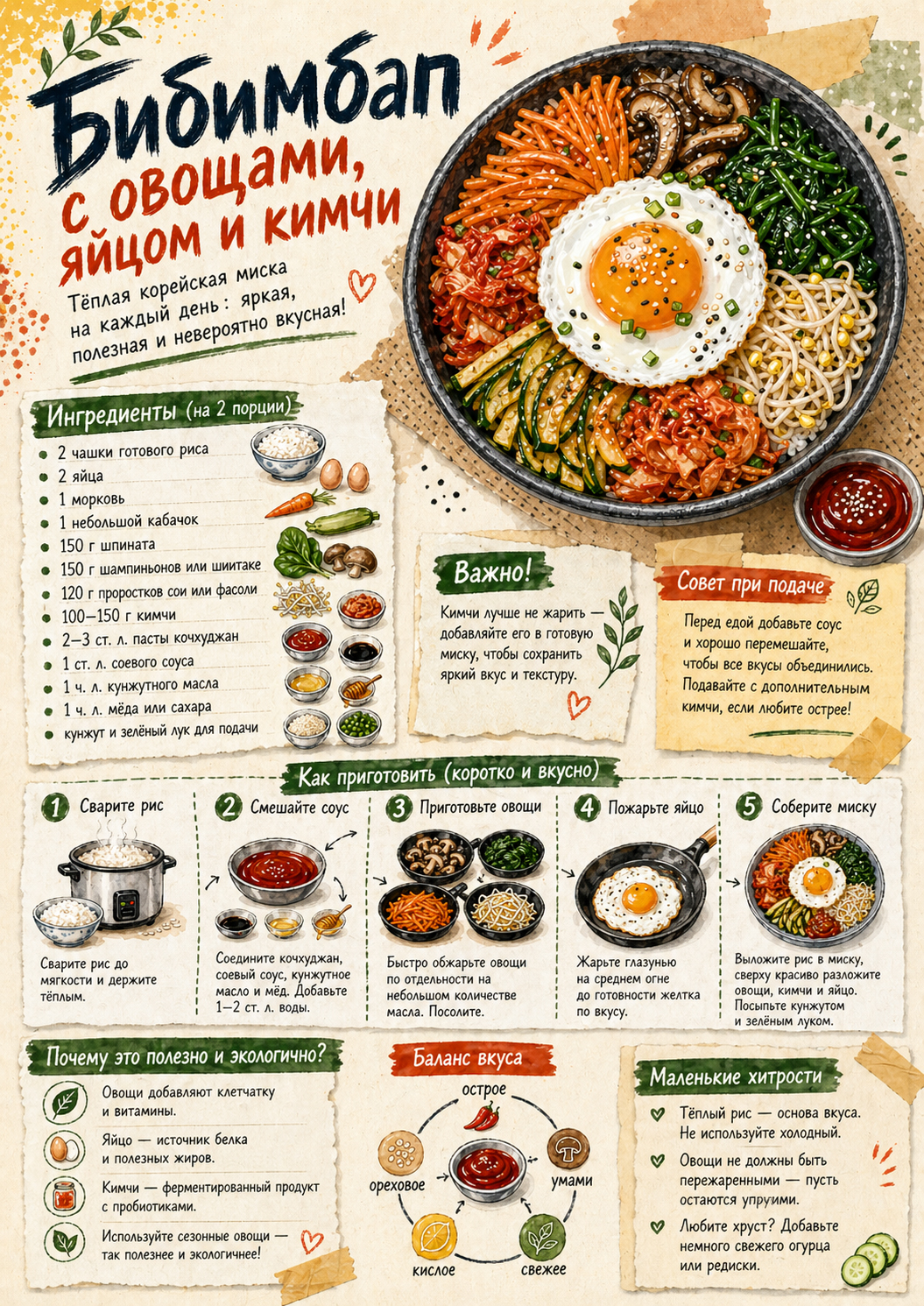 Этот рецепт хорошо подходит для домашнего ужина, когда хочется чего-то яркого, но без сложной кулинарной постановки. Главное – держать рис тёплым, овощи готовить недолго, кимчи не жарить, а соус добавлять постепенно. Тогда бибимбап получится насыщенным, аккуратным и действительно вкусным.