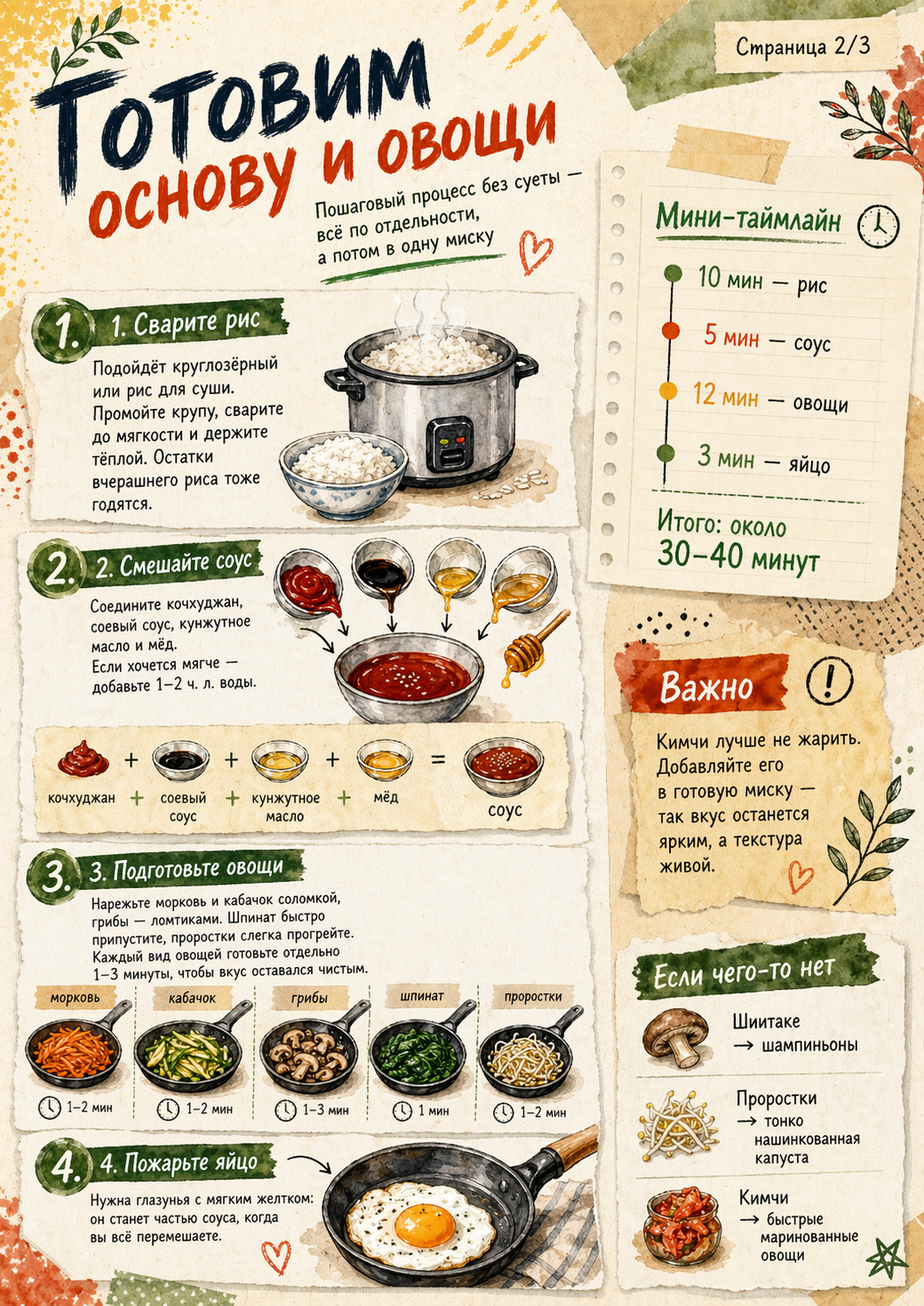 Бибимбап хорош тем, что у него понятная конструкция: рис, овощи, белок, ферментированный акцент, соус и топпинги. Все компоненты можно подготовить отдельно, а затем собрать в одной миске прямо перед подачей.