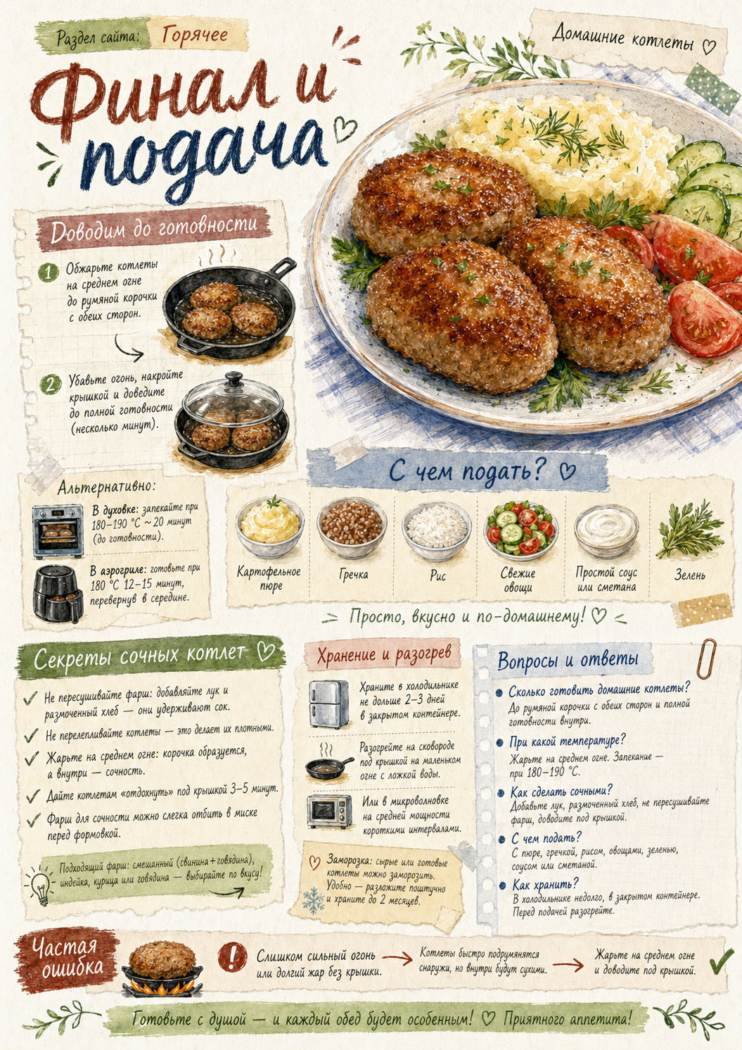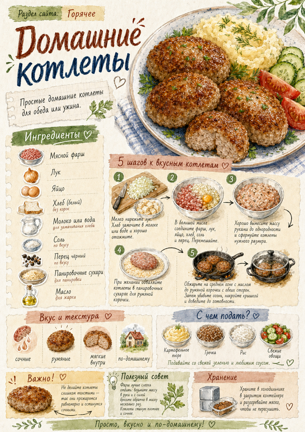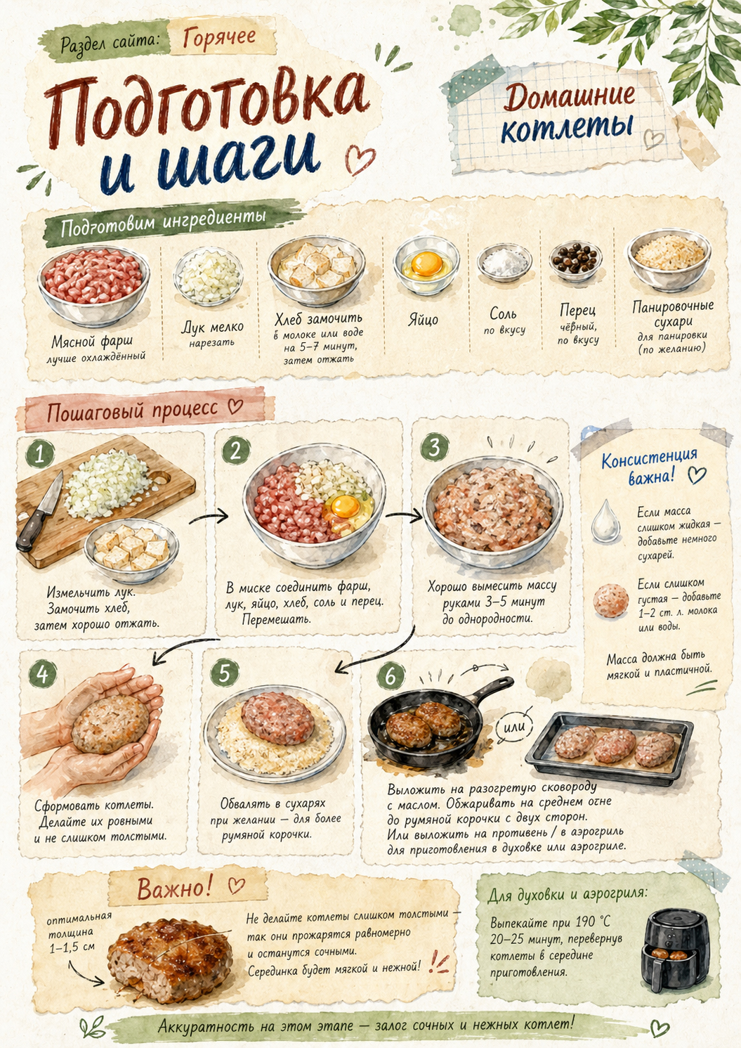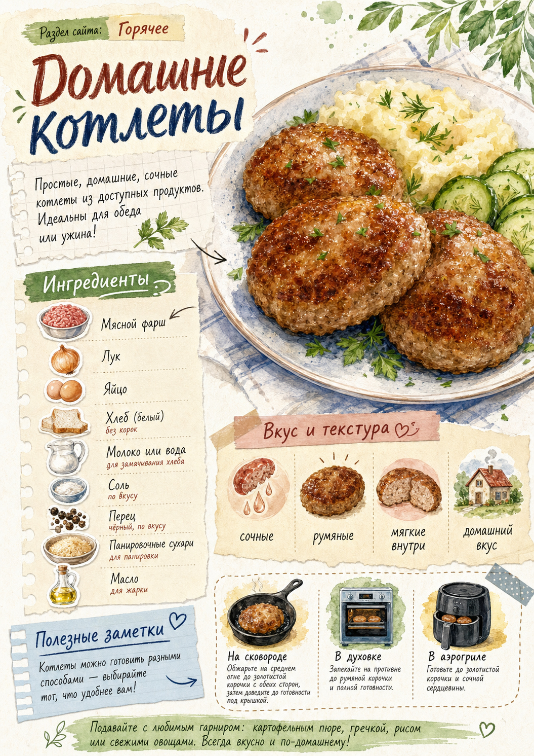 Домашние котлеты хороши тем, что их можно подстроить под привычный вкус: сделать более нежными, добавить панировку, приготовить на сковороде, в духовке или аэрогриле. Это понятное горячее блюдо без сложной техники, которое легко сочетать с разными гарнирами.