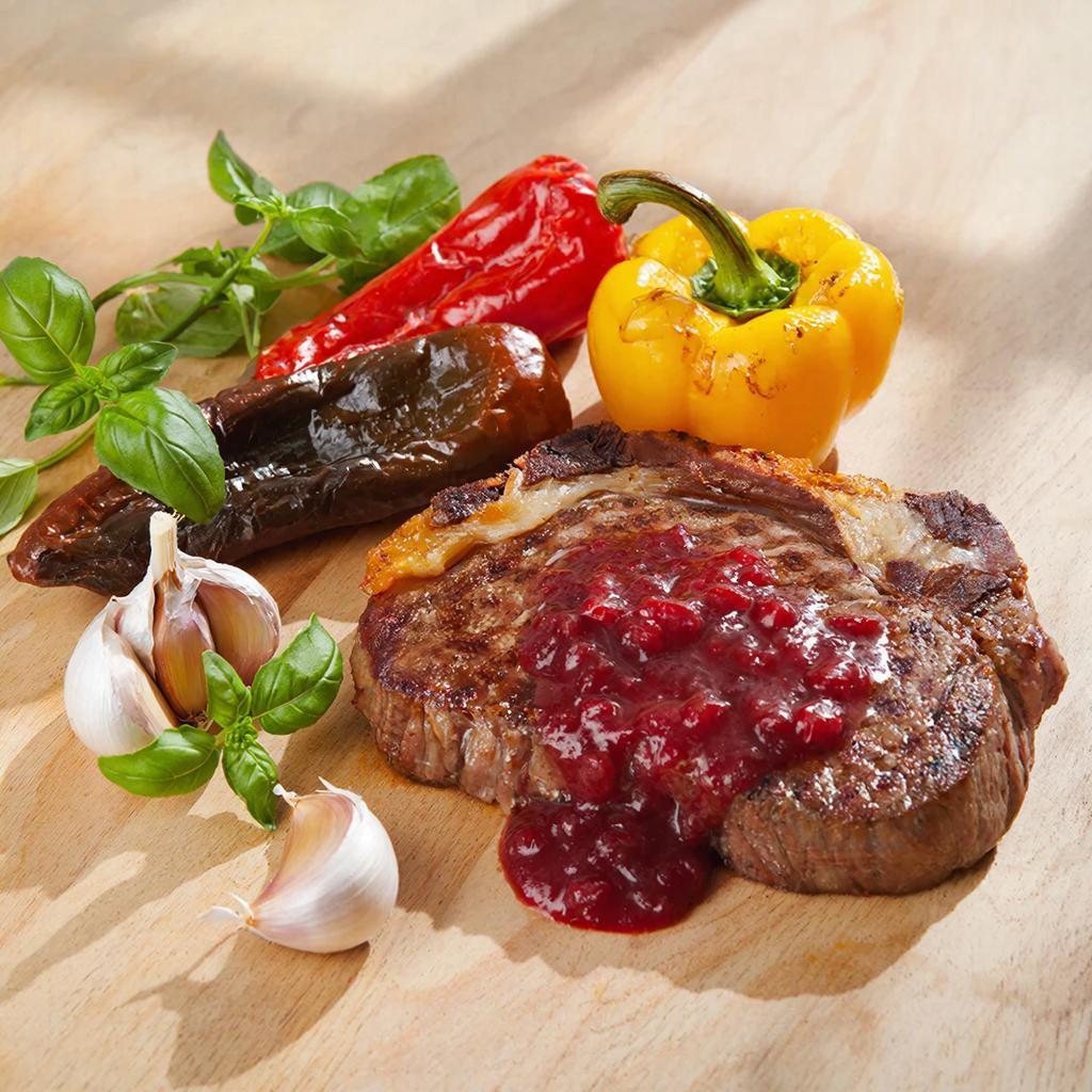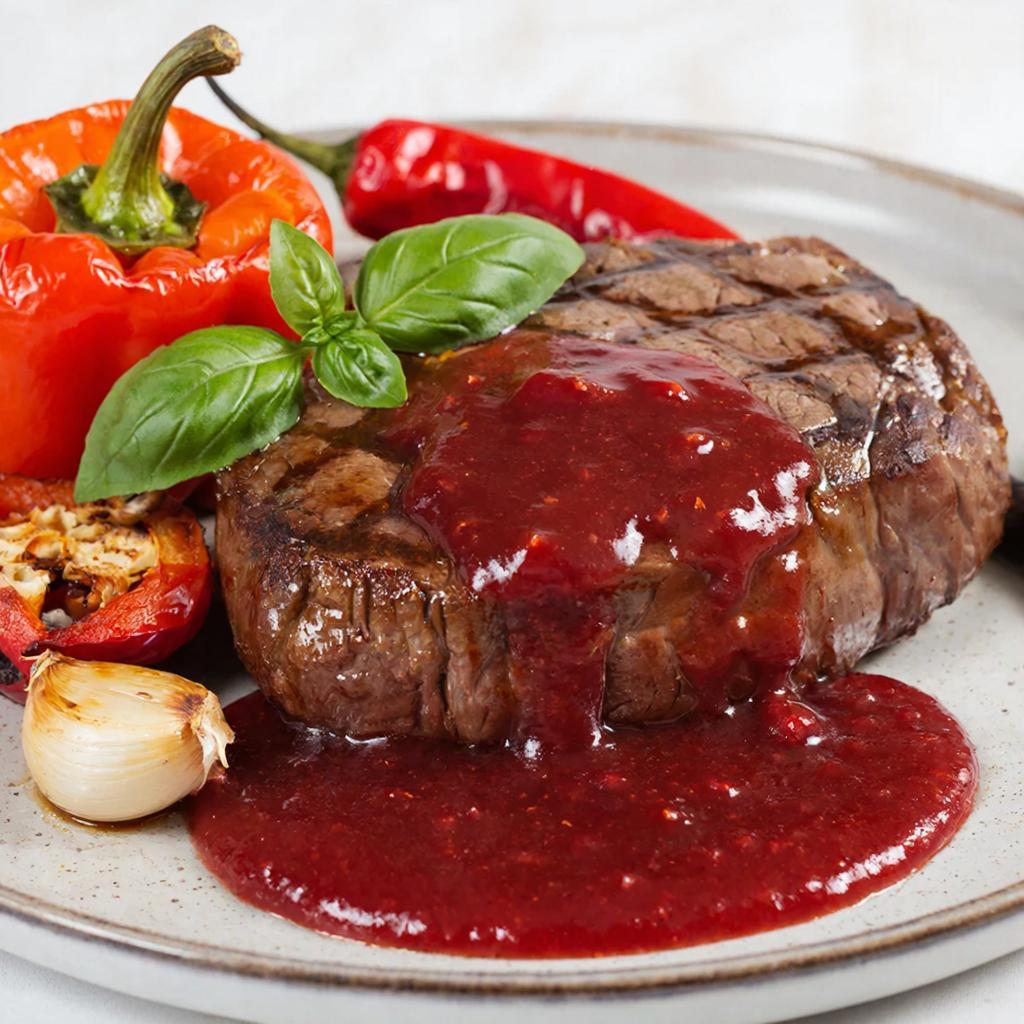 Стейк с клюквенным соусом – это выразительное мясное блюдо, в котором плотный вкус говядины сочетается с кисло-сладким ягодным акцентом. Дополняют подачу печёные перцы, чили и чеснок, поэтому блюдо получается не только ярким по вкусу, но и очень эффектным визуально.