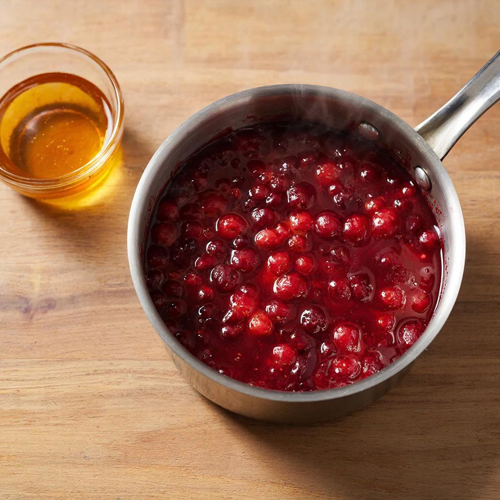 Коньяк вливают после прогревания клюквы с мёдом, затем соус проваривают ещё 2 минуты.
