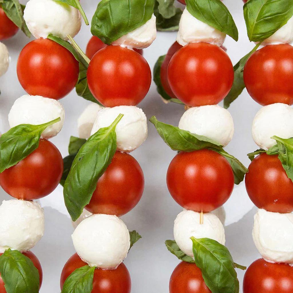 - Используйте мини-моцареллу и черри, нанизанные на шпажку с листиком базилика.
