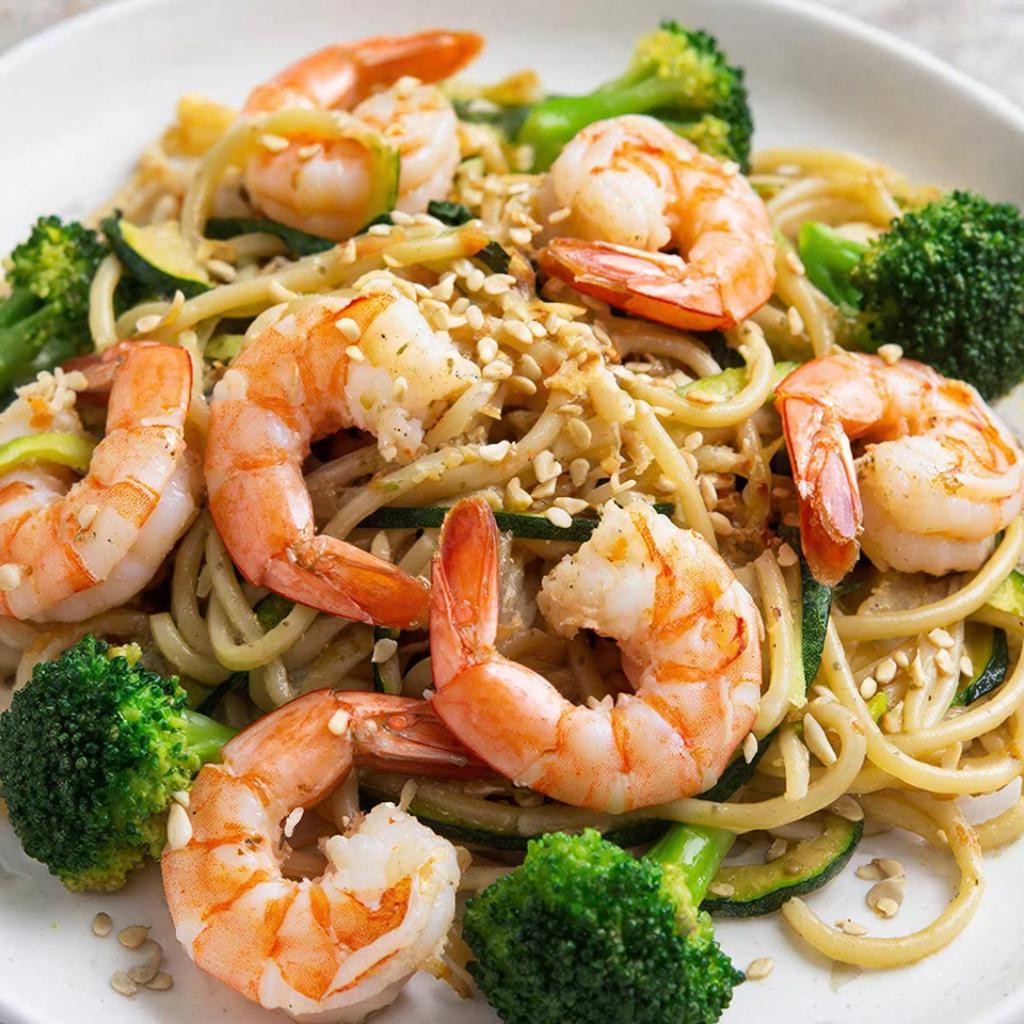 Как приготовить креветки с лапшой из кабачка и брокколи