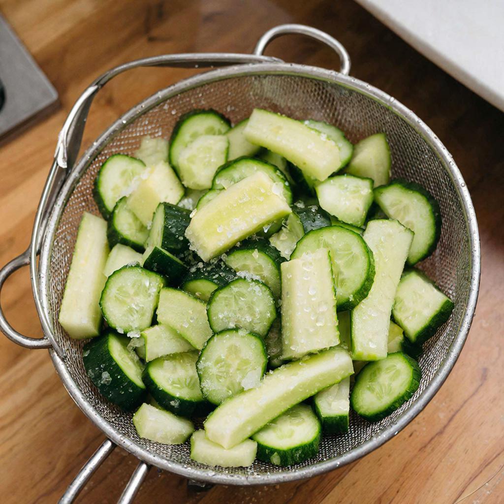 Молодые кабачки и свежие огурцы нарежьте тонкой соломкой. Переложите их в дуршлаг, слегка посолите и аккуратно перемешайте. Оставьте на 10 минут, чтобы стекла лишняя жидкость. После этого слегка отожмите овощи столовой ложкой – так салат получится более плотным и не водянистым. Кстати, похожий приём с удалением лишней жидкости часто используется и в других овощных салатах, например, в классическом Греческом салате – это помогает сохранить хруст и насыщенность вкуса.