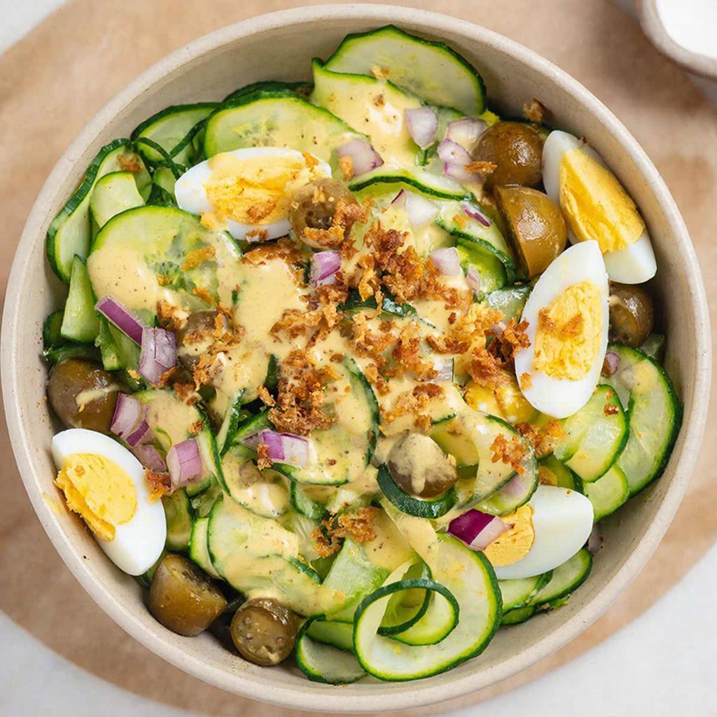 В большой миске соедините кабачки, огурцы, корнишоны, лук, чеснок и яйца. Аккуратно перемешайте, чтобы ингредиенты равномерно распределились. Полейте заправкой и снова осторожно перемешайте.