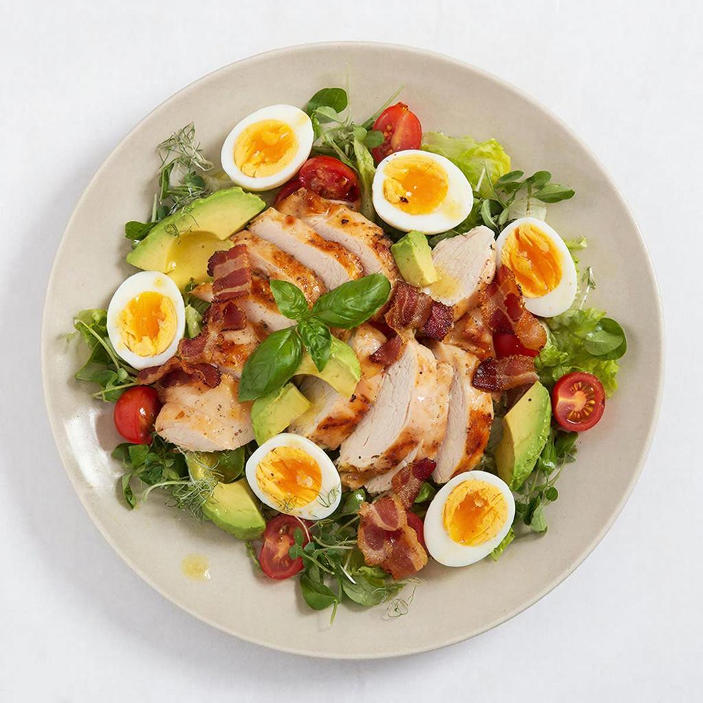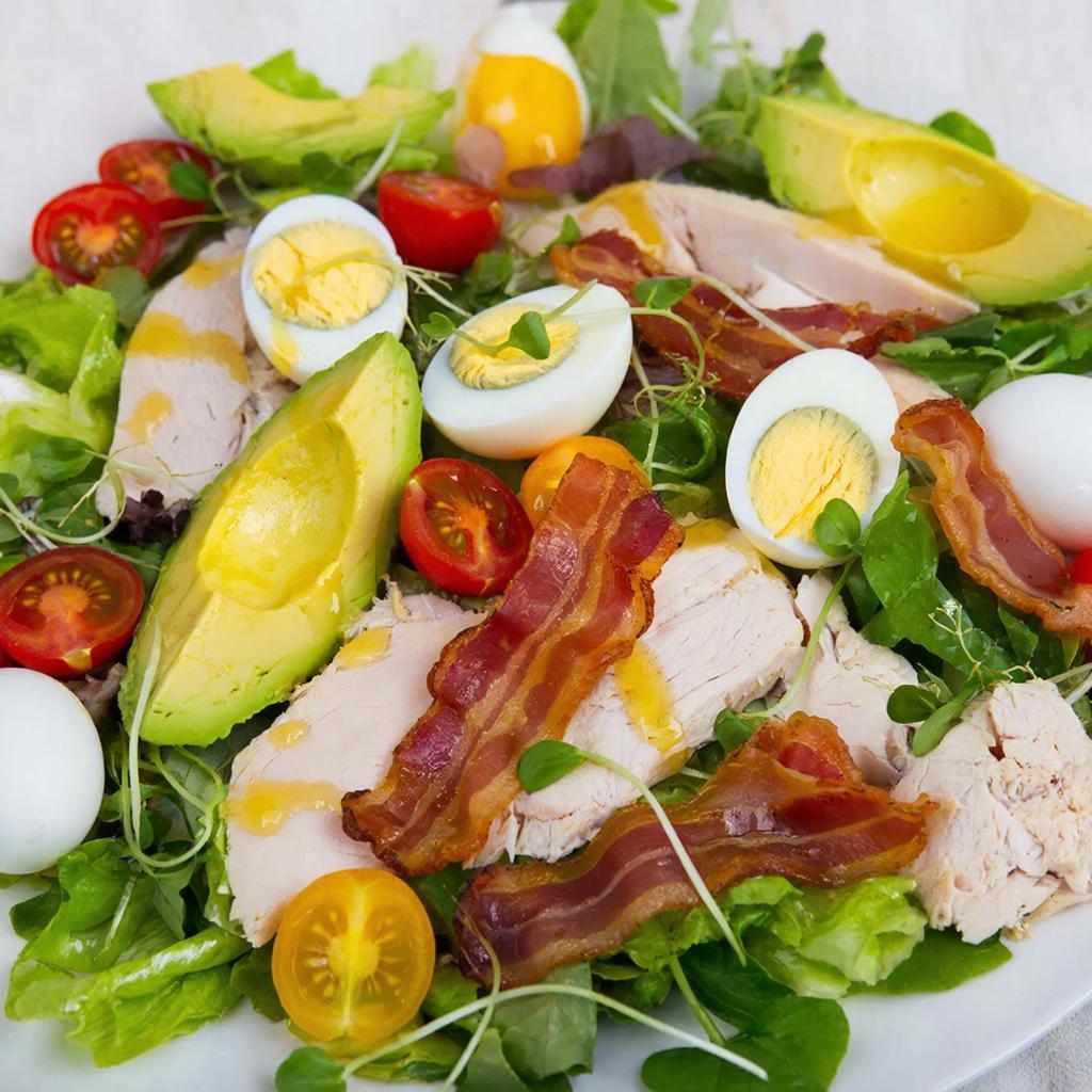 Короткий ответ: здесь хорошо уравновешены плотные и легкие ингредиенты. Куриная грудка и яйца делают салат сытным, бекон добавляет выраженный жареный акцент, авокадо смягчает вкус, а черри и листья салата дают сочность и свежесть.
