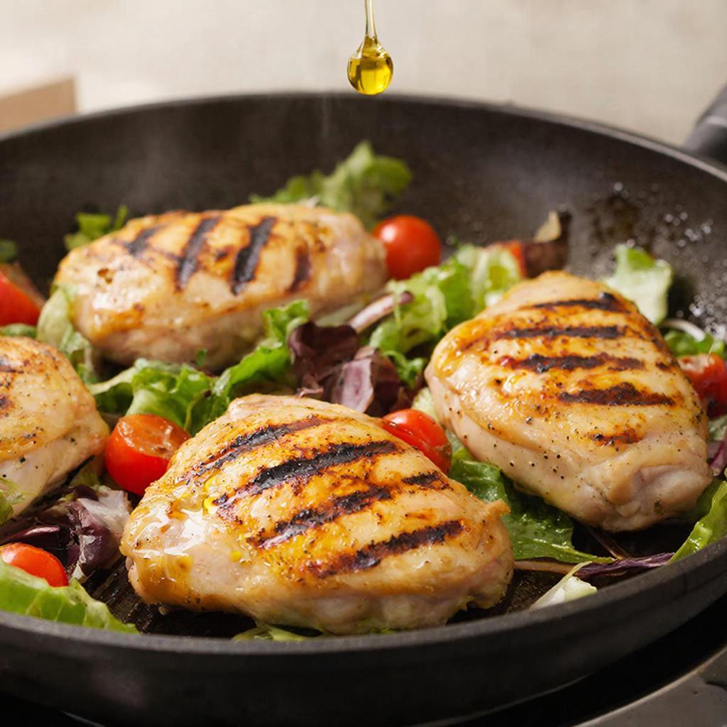 Ориентир в этом рецепте – жарка по 10 минут с каждой стороны на сковороде-гриль и короткий отдых под фольгой. После этого грудку удобно нарезать ломтиками, и она хорошо держит форму на блюде.