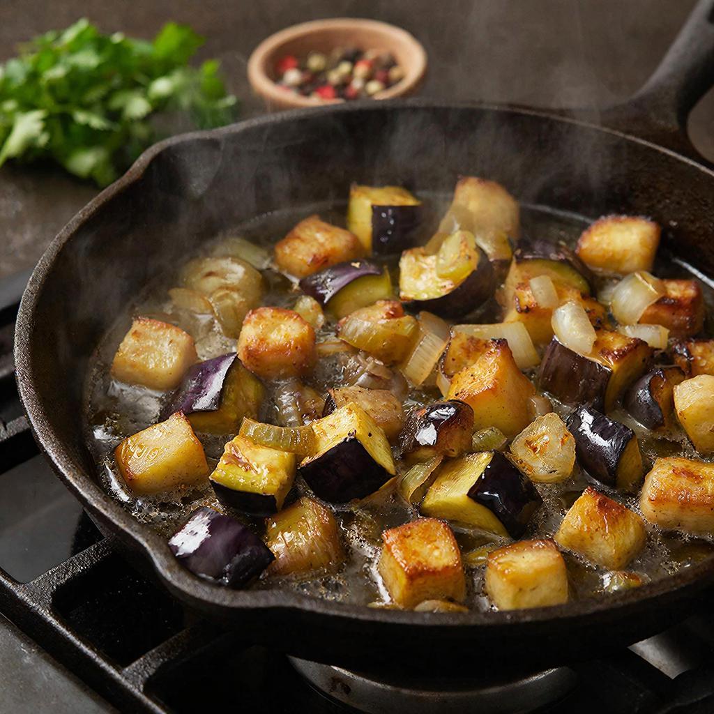 В этом рецепте кожура помогает кусочкам сохранить форму при тушении. Если вы предпочитаете более нежную текстуру без кожицы, можете очистить баклажаны перед нарезкой, но тогда кубики будут быстрее развариваться.