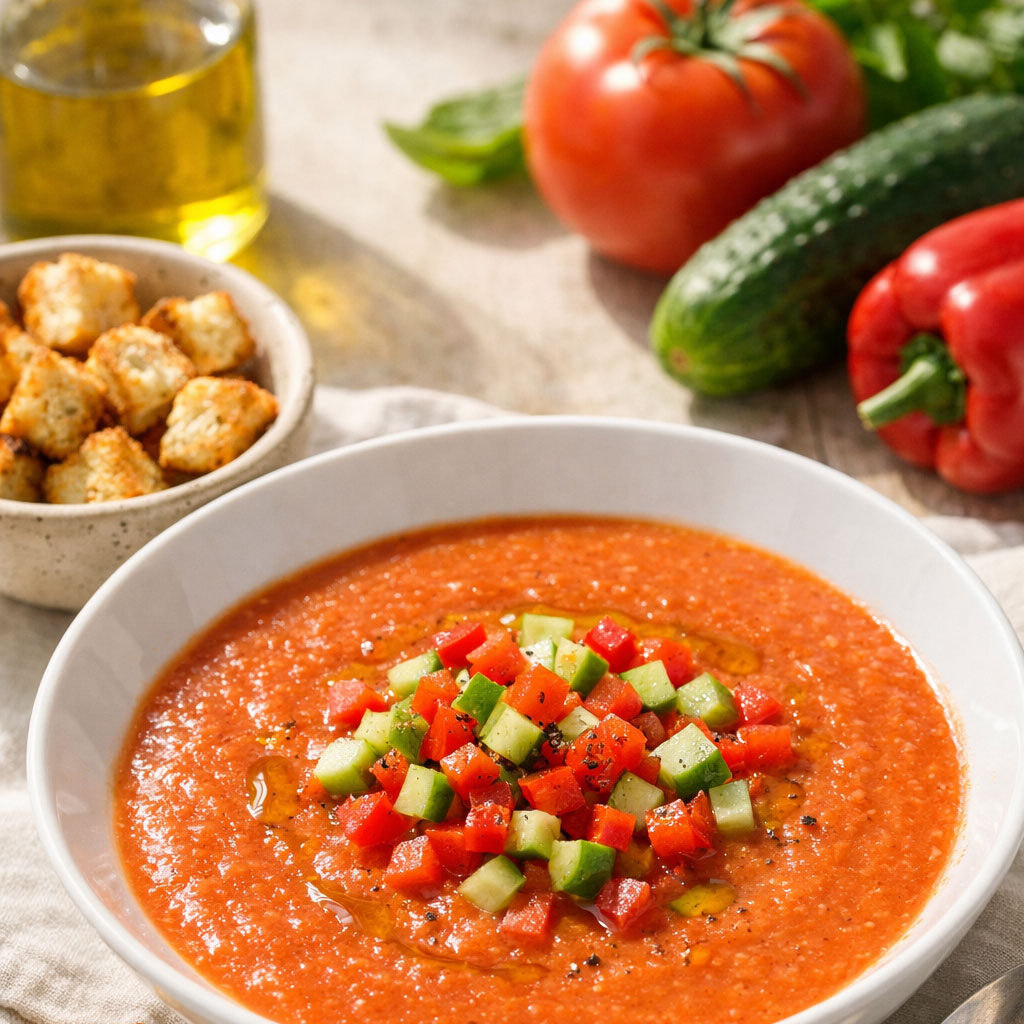 Андалузский гаспачо – это освежающий холодный суп на основе помидоров, огурца, перца, лука, чеснока и хлеба. По этому рецепту суп получается лёгким, гладким и ярким по вкусу, а ледяная вода помогает сделать текстуру особенно приятной для летней подачи.