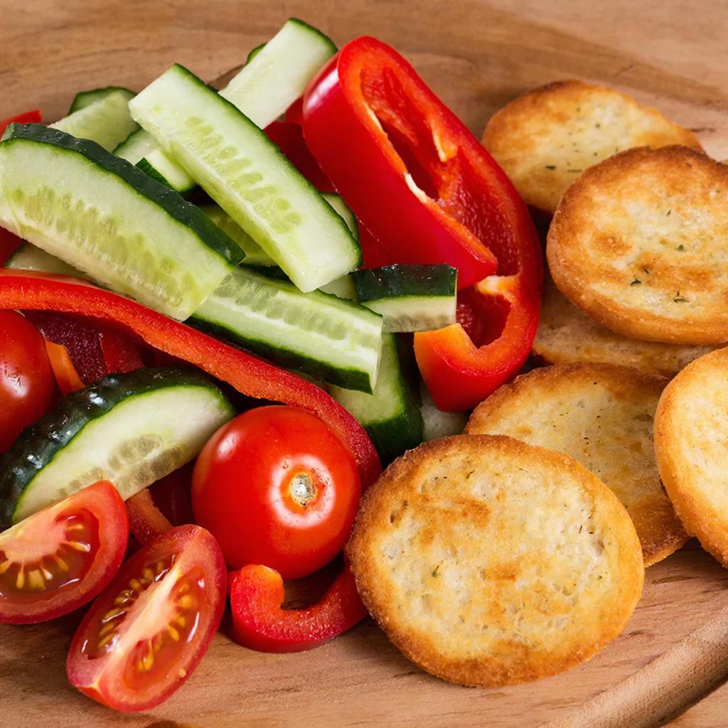 Для подачи нарежьте кубиками маленький огурец, красный перец и помидор. Подготовьте гренки.