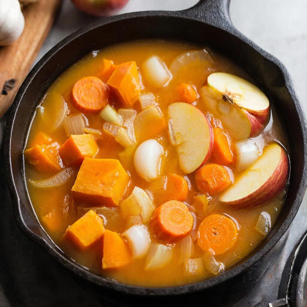 После тыквы добавьте яблоки и острый перец. Яблоки дают супу мягкую фруктовую нотку, а перец помогает сделать вкус не плоским, а более живым.